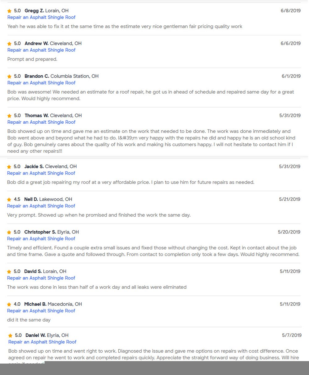 Call us for any roof related problem.. 440-954-2622 .. if no answer.. we are probably busy working, so PLEASE leave a message and we will return your call. We can usually provide same day service.